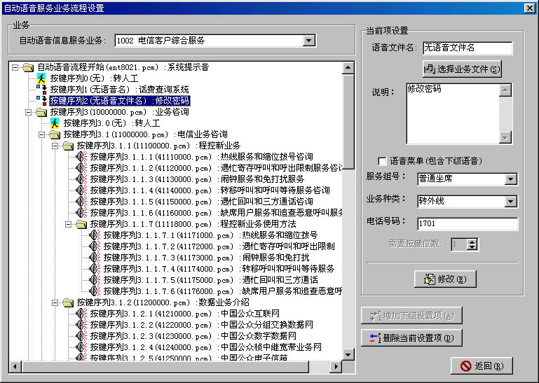 。。智能業(yè)務管理系統(tǒng)是Utron-CC2000進行業(yè)務擴充的主要手段。用戶如需擴展新的業(yè)務,主要通過智能業(yè)務管理系統(tǒng)向Utron-CC2000注冊該業(yè)務;并為系統(tǒng)中的座席分配業(yè)務。根據實際業(yè)務的需求,生成相應的系統(tǒng)信箱、業(yè)務腳本、服務項目等,來實現(xiàn)新業(yè)務的動態(tài)加載。