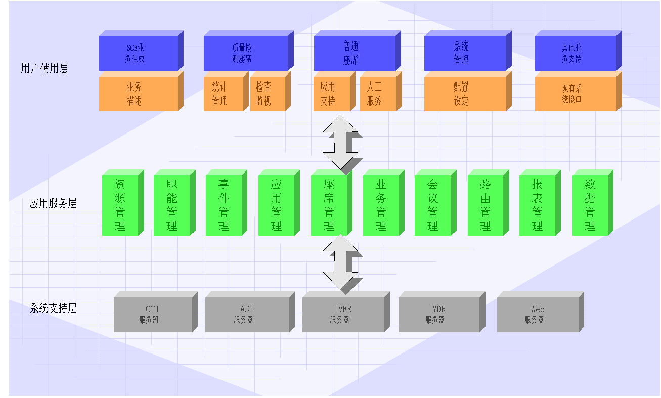 采用功能分散,統(tǒng)一管理的設計模式。各組件功能相對獨立,分布式處理各項事務,它們的有機結合實現(xiàn)了功能完善的ACD服務器。各組件的預留接口提供了功能擴充的有效途徑。功能包括: