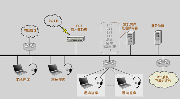 升級的呼叫中心系統(tǒng)融合了多種通訊技術(shù),使得媒體接入的形式更加廣泛,在繼承傳統(tǒng)媒體接入的同時,還可以處理網(wǎng)絡(luò)電話、Email、短消息、語音信箱、傳真、網(wǎng)絡(luò)傳真以及擴展的客戶端接入。