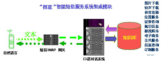 "得意"智能短信系統(tǒng)是在現(xiàn)有的數(shù)據(jù)通信和短信服務(wù)的技術(shù)平臺(tái)上,加入基于中文語(yǔ)言理解技術(shù)的"得意"口語(yǔ)對(duì)話(huà)系統(tǒng),從而能夠讓用戶(hù)在手機(jī)上以自然語(yǔ)言的形式享受指定領(lǐng)域的智能短信服務(wù)。智能短信系統(tǒng)對(duì)短信文本進(jìn)行自動(dòng)分析和理解,再?gòu)闹R(shí)庫(kù)中提取用戶(hù)所需的信息,然后自動(dòng)產(chǎn)生智能應(yīng)答語(yǔ)句,并以短信文本的形式發(fā)回用戶(hù)。由于"得意"口語(yǔ)對(duì)話(huà)系統(tǒng)具有上下文相關(guān)理解和人機(jī)混合主導(dǎo)等強(qiáng)大功能,在規(guī)定的領(lǐng)域內(nèi),用戶(hù)可通過(guò)一個(gè)或者多個(gè)短信構(gòu)成一組對(duì)話(huà),完成復(fù)雜的信息查詢(xún)或者其他互動(dòng)服務(wù)。