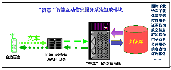 "得意口語對話系統(tǒng)"可以充分滿足互聯(lián)網(wǎng)、短信、WAP等業(yè)務(wù)的智能互動信息服務(wù)需求,為SP和用戶提供了更易用、好用、實用的信息交流平臺。