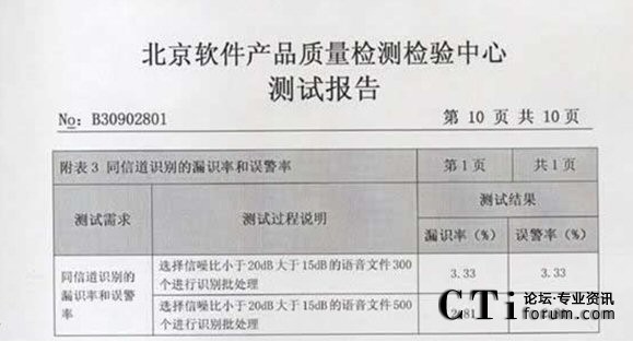 CTI論壇(ctiforum)06月25日消息: 2009年3月02-10日:北京軟件產品質量檢測檢驗中心對《海量語音文件的目標說話人篩選系統(tǒng)》進行了全面測試包括用戶文檔、功能性、可靠性、易用性、可維護性等多個特性。測試結果表明《海量語音文件的目標說話 2009年3月02-10日,北京軟件產品質量檢測檢驗中心對《海量語音文件的目標說話人篩選系統(tǒng)》進行了全面人篩選系統(tǒng)》滿足軟件相關國家標準中的要求,系統(tǒng)在模擬測試環(huán)境中運行正常、穩(wěn)定,正式通過北京軟件產品質量檢測檢驗中心的嚴格測試,系統(tǒng)的漏識率和誤警率分別達到了2.81%和 2.81%。