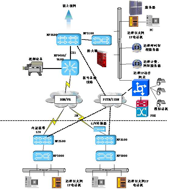目前許多公安系統(tǒng)雖然采用具有IP語(yǔ)音功能的路由設(shè)備組建網(wǎng)絡(luò),但在業(yè)務(wù)語(yǔ)音交流通常還通過PBX集團(tuán)交換機(jī)走電信PSTN/ISDN電話網(wǎng),這樣無(wú)法節(jié)省電話費(fèi)用,反而增加了辦公費(fèi)用。邁普IP語(yǔ)音解決方案采用了邁普MyPower VG2000IP語(yǔ)音網(wǎng)關(guān)和邁普以太網(wǎng)IP電話進(jìn)行改造。在整個(gè)網(wǎng)點(diǎn)語(yǔ)音終端全部設(shè)備選用經(jīng)濟(jì)型邁普以太網(wǎng)IP電話機(jī),它采用雙以太口設(shè)計(jì),使網(wǎng)絡(luò)無(wú)需重新布線,同時(shí)也可使用已有的路由器上IP語(yǔ)音模塊;邁普以太網(wǎng)IP電話機(jī)之間的話音通信通過邁普呼叫管理服務(wù)器集中控制。在主體IP網(wǎng)絡(luò)中,邁普IP語(yǔ)音網(wǎng)關(guān)放置于中心機(jī)房作為傳統(tǒng)PSTN的出口,可以通過VOS接口、E1接口(中國(guó)一號(hào)信令)、E&M接口等多種方式接入公安PBX,將PSTN線路傳來(lái)的時(shí)分話音或傳真信息進(jìn)行分組和壓縮,轉(zhuǎn)換成IP數(shù)據(jù)包,通過路由設(shè)備路由到目的地;在沒有PBX的公安機(jī)房,邁普IP語(yǔ)音網(wǎng)關(guān)可以提供32路的模擬用戶接口,可以完全替代傳統(tǒng)PBX并接入PSTN,并提供額外功能,如圖中虛線所示;整個(gè)方案還可以針對(duì)公安用戶特殊需求"定做"特色功能,例如緊急告警等方便日常辦公。