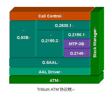 Trillium提供完整的ATM協(xié)議棧,同時(shí)支持ITU和ATM Forum的標(biāo)準(zhǔn),相關(guān)產(chǎn)品包括AAL2 Signalling(Q.2630.1、Q.2150.1和Q.2150.2)、Q.93B(Q.2931)、Q.2140、Q.SAAL(Q.2130、Q.2110)、B-ISUP、VTOA、IME(ILMI