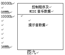地址分配如下:00000h-0ffffh用于存放控制程序及MIDI音樂數(shù)據(jù),10000-3ffffh存放提示音數(shù)據(jù)。
