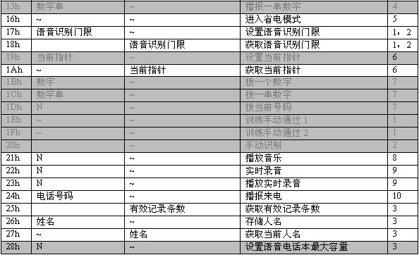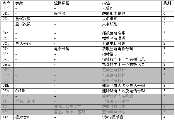 命令描述: 訓(xùn)練一個名字。當(dāng)增加一條電話本記錄時,應(yīng)先執(zhí)行此命令。該命令會生成一個語音模板,同時產(chǎn)生一個長達(dá)2秒的名字錄音。在此命令成功執(zhí)行之后,MCPU接著發(fā)送06h命令增加電話號碼。如果沒有執(zhí)行06h命令,則該項(xiàng)記錄電話號碼為空。