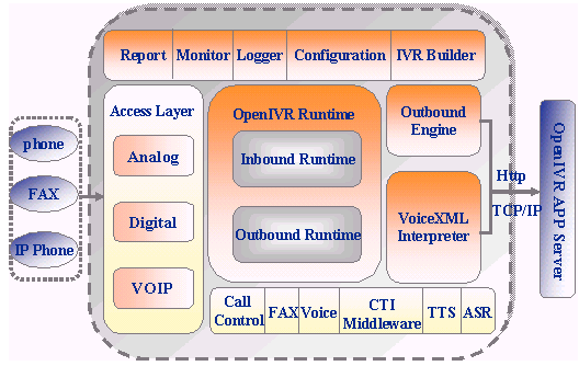 OpenIVR通過了業(yè)界主要的CTI中間件和PBX集成測試,是呼叫中心系統(tǒng)IVR服務器的理想選擇;而集成商只需簡單掌握VoiceXML語言,就可以方便地定制業(yè)務及流程;下面是 OpenIVR系統(tǒng)結(jié)構(gòu)圖: