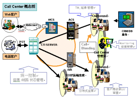 支持多種接入和呼出方式,支持網絡坐席及多媒體應用。功能包括:普通電話接入,IP電話,傳真,Web接入,網絡聊天TextChat、Email、網際協作、網頁同步、視頻交互、文件傳輸、網絡白板……