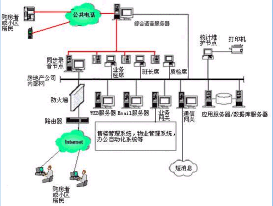 。。用戶利用電話、傳真、WEB、手機(jī)短信息、電子郵件等撥打某一特服號(hào)碼(如95xxx)進(jìn)入房地產(chǎn)多媒體客戶服務(wù)中心系統(tǒng),本系統(tǒng)依托房地產(chǎn)企業(yè)各類業(yè)務(wù)技術(shù)支持系統(tǒng),通過人工受理或自動(dòng)語音服務(wù)等方式為各類客戶提供購房和物業(yè)管理服務(wù);形成了對(duì)外服務(wù)于客戶,對(duì)內(nèi)管理、分析、決策系統(tǒng)相結(jié)合的呼叫中心。