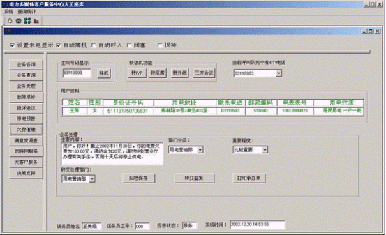 。。提供電話、傳真、電子郵件、因特網(wǎng)、手機(jī)、網(wǎng)絡(luò)電話等多種通訊方式接入和呼出,全天候24小時(shí)服務(wù);無論以何種方式接入系統(tǒng),都可以用統(tǒng)一的方式進(jìn)行后臺處理,全面體貼居民的需要,有效擴(kuò)大電力系統(tǒng)的服務(wù)范圍!