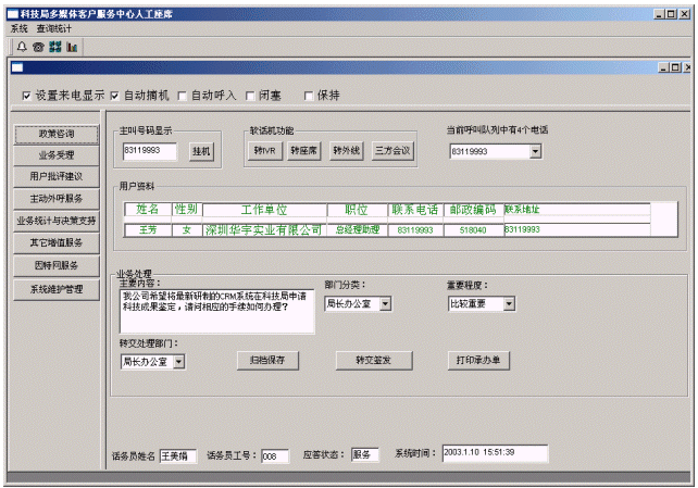 企業(yè)或個(gè)人打入電話后,可以選擇人工服務(wù),同座席話務(wù)人員直接溝通,由話務(wù)人員將企業(yè)或個(gè)人反映的問(wèn)題和提出的建議意見(jiàn)記錄下來(lái),并同時(shí)記錄下該客戶的聯(lián)系方式,將相關(guān)數(shù)據(jù)添加入系統(tǒng)數(shù)據(jù)庫(kù);也可以在數(shù)據(jù)庫(kù)的支持下回答企業(yè)或個(gè)人對(duì)科技成果和政策法規(guī)的咨詢和疑問(wèn)。企業(yè)或個(gè)人也可以選擇自動(dòng)語(yǔ)音服務(wù)方式,根據(jù)系統(tǒng)的語(yǔ)音提示輸入按鍵,選擇類(lèi)別,將自己的投訴和建議以及自己的聯(lián)系方式信息以留言錄音的方式保存在系統(tǒng)中。系統(tǒng)同時(shí)還支持自動(dòng)傳真方式,企業(yè)或個(gè)人可以通過(guò)傳真機(jī)打通客戶服務(wù)中心,通過(guò)按鍵選擇傳真方式,將自己的意見(jiàn)建議等的文本內(nèi)容傳真給系統(tǒng),系統(tǒng)自動(dòng)接受并存入數(shù)據(jù)庫(kù)。