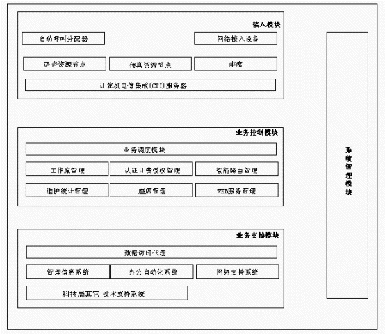 系統(tǒng)管理模塊提供對(duì)全系統(tǒng)完善的設(shè)備管理、網(wǎng)絡(luò)管理、運(yùn)營(yíng)維護(hù)管理、服務(wù)質(zhì)量管理、業(yè)務(wù)信息管理及決策分析等功能,幫助科技局客戶服務(wù)中心運(yùn)營(yíng)者用好系統(tǒng),把握市場(chǎng)動(dòng)態(tài),不斷提高服務(wù)質(zhì)量。