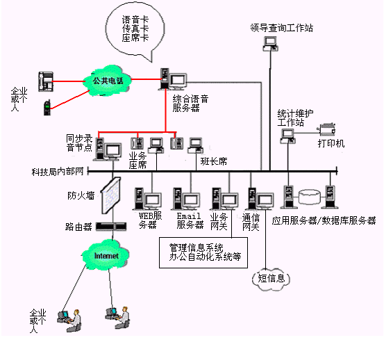 應(yīng)用現(xiàn)代先進(jìn)的CTI技術(shù)建立的科技局公開(kāi)電話系統(tǒng),改變了傳統(tǒng)的科技局辦公的一部電話、一支筆、一個(gè)本(或用計(jì)算機(jī)當(dāng)打字機(jī))的記錄、交流模式。在充分利用各級(jí)科技局現(xiàn)有辦公自動(dòng)化系統(tǒng)基礎(chǔ)上,通過(guò)共享科技局、社會(huì)網(wǎng)絡(luò)資源,能夠?yàn)槠髽I(yè)或個(gè)人提供了更多、更好、更便捷的服務(wù)。
