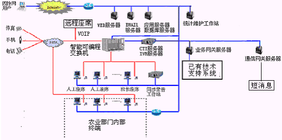 客戶利用電話、傳真、手機(jī)等撥打統(tǒng)一的特服號(hào)碼(如800XXX或9XXXX)或因特網(wǎng)進(jìn)入農(nóng)業(yè)分布式呼叫中心,本系統(tǒng)依托農(nóng)業(yè)部門各類計(jì)算機(jī)業(yè)務(wù)技術(shù)支持系統(tǒng)和網(wǎng)絡(luò)系統(tǒng),實(shí)現(xiàn)與農(nóng)業(yè)部門原有管理系統(tǒng)/業(yè)務(wù)系統(tǒng)及數(shù)據(jù)庫(kù)的無(wú)縫連接,通過(guò)人工受理或自動(dòng)語(yǔ)音服務(wù)等方式全天24小時(shí)不間斷地為客戶提供各種服務(wù)。