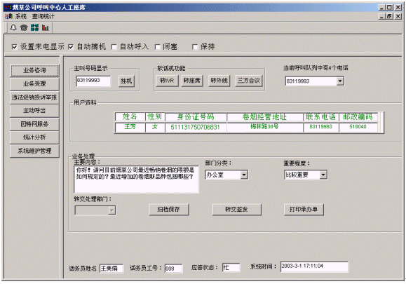 客戶打入電話后,當(dāng)系統(tǒng)的自動(dòng)語(yǔ)音應(yīng)答子系統(tǒng)無(wú)法解決客戶問(wèn)題時(shí),客戶可選擇人工服務(wù),由客戶服務(wù)代表直接接聽(tīng)客戶電話,處理并解決客戶問(wèn)題。此時(shí)客戶同座席話務(wù)人員直接溝通,并同時(shí)記錄下該客戶的聯(lián)系方式,將相關(guān)數(shù)據(jù)添加入系統(tǒng)數(shù)據(jù)庫(kù);也可以在數(shù)據(jù)庫(kù)的支持下處理傳真業(yè)務(wù),電子郵件,計(jì)算機(jī)文件傳輸、滿意度調(diào)查等。