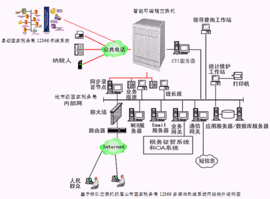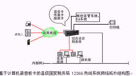 對(duì)于縣級(jí)國(guó)家稅務(wù)局12366多媒體納稅服務(wù)熱線系統(tǒng),則建議使用基于計(jì)算機(jī)語(yǔ)音板卡的方式,可以減少投資,同時(shí)具有良好的系統(tǒng)性能;對(duì)于地市級(jí)-縣級(jí)國(guó)家稅務(wù)局12366多媒體納稅服務(wù)熱線系統(tǒng),可選用排隊(duì)交換機(jī)作為語(yǔ)音接入設(shè)備,以保障系統(tǒng)的高可靠性和穩(wěn)定性;大大提高了系統(tǒng)的適應(yīng)面。