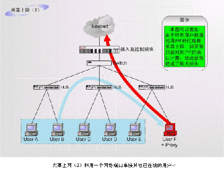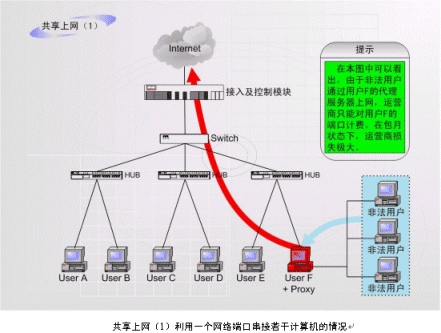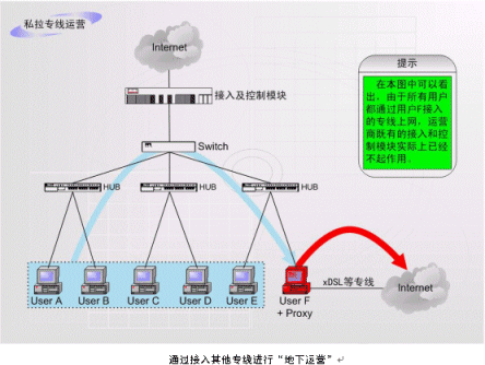 非法運(yùn)營情況之二:如上圖中的F用戶作為運(yùn)營商的合法包月用戶,上網(wǎng)服務(wù)開通以后,在自己的計(jì)算機(jī)中安裝代理服務(wù)軟件或者安裝路由器,這樣就可以隨時(shí)糾集若干住戶分?jǐn)偘沦M(fèi)用,甚至私設(shè)網(wǎng)吧。