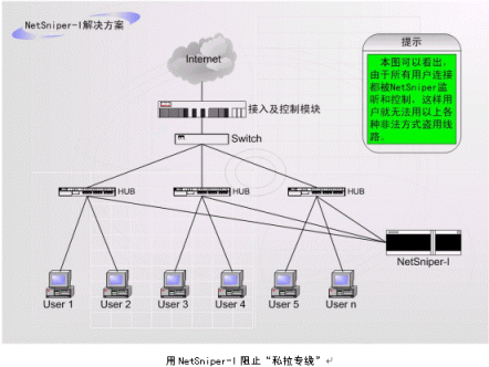 (4)"NetSniper網(wǎng)絡(luò)尖兵"使用起來非常方便,和運(yùn)營商現(xiàn)有的設(shè)備配合極其簡單:不需要改變現(xiàn)有的網(wǎng)絡(luò)結(jié)構(gòu)、不影響網(wǎng)絡(luò)的性能、與用戶無關(guān)、集中維護(hù)、控制模式靈活。