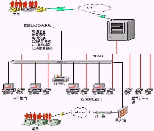 自動(dòng)語音應(yīng)答系統(tǒng)是計(jì)算機(jī)和電話語音板卡的結(jié)合體,在相關(guān)軟件的控制下,可代替人工自動(dòng)接聽學(xué)員電話。自動(dòng)語音應(yīng)答系統(tǒng)的主要功能包括: