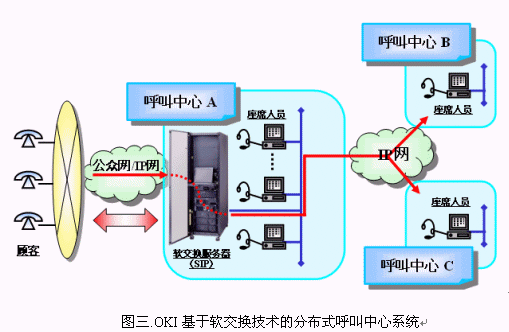 軟交換(Soft Switch)技術的出現(xiàn)實現(xiàn)了上述想法。目前,采用軟交換技術的呼叫中心已經(jīng)在中國市場展露頭角。其中,日本通信企業(yè)沖電氣(OKI)工業(yè)株式會社在中國推出的以軟交換為核心技術的新一代呼叫中心是較為典型的代表。