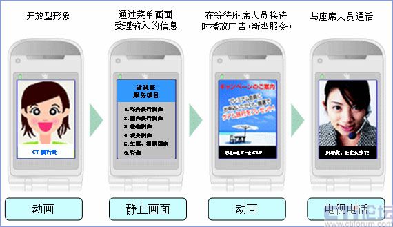 以往的IVR根據(jù)選擇項、層數(shù),必須多遍聽取語音內(nèi)容才能找到預期的菜單,成了一大課題。視頻呼叫中心則在FOMA的畫面上顯示服務菜單,通過選擇號碼可以簡化聽取語音的過程。而且,在連接客服人員的電話等待時間中可以播放廣告。通過靈活運用這些功能,提高了IVR的操作性,提供了新型廣告宣傳的機會。