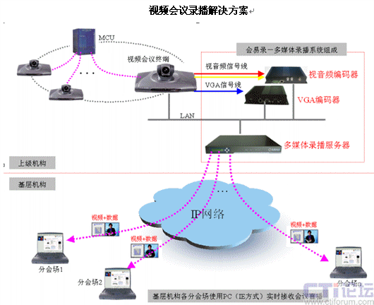 如圖所示,上級機構視音頻編碼器接在視音頻源上,對視音頻信號采集,VGA編碼器采集VGA信號,通過網(wǎng)絡傳給放在機房的多媒體錄播服務器。基層機構的各個分會場通過IE瀏覽器的方式接受會議直播。