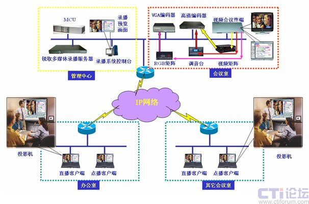 如圖所示:多媒體錄播服務(wù)器放置在管理中心,高清編碼器(采集高清視頻及聲音)及VGA編碼器(采集雙流信號(hào))放置在會(huì)議室,客戶端可以是網(wǎng)絡(luò)內(nèi)的任意一臺(tái)計(jì)算機(jī)。整個(gè)系統(tǒng)簡(jiǎn)單明了,分布靈活,部署簡(jiǎn)單,系統(tǒng)只要連接了信號(hào)線,配置了IP地址即可投入使用,無須專業(yè)布線。各部分配置如下: