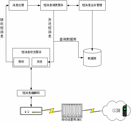 用戶確定發(fā)送后經(jīng)過發(fā)送函數(shù)調(diào)用底層的設備DLL,通過GSM-MODEM發(fā)送至運營商的短消息服務中心(SMSC),再轉(zhuǎn)發(fā)至接收地址的手機上,從而完成發(fā)送流程。