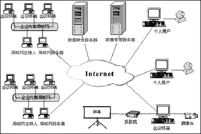 會議帶寬管理 可以設(shè)置會議所需要的網(wǎng)絡(luò)帶寬,當(dāng)客戶端連接到服務(wù)器后,將根據(jù)服務(wù)器設(shè)定的會議帶寬決定本地視頻采集的幀率。例如,如果服務(wù)器設(shè)定的會議帶寬為56Kbps,則所有連接到服務(wù)器的客戶端將以1~3幀/秒的幀率進行視頻采集;如果服務(wù)器設(shè)定的會議帶寬為256Kbps,則所有連接到服務(wù)器的客戶端將以8~10幀/秒的幀率進行視頻采集。由于上網(wǎng)條件與網(wǎng)絡(luò)環(huán)境的千差萬別,設(shè)定固定的會議帶寬有利于保證會議的正常穩(wěn)定進行(系統(tǒng)結(jié)構(gòu)如下圖所示)。