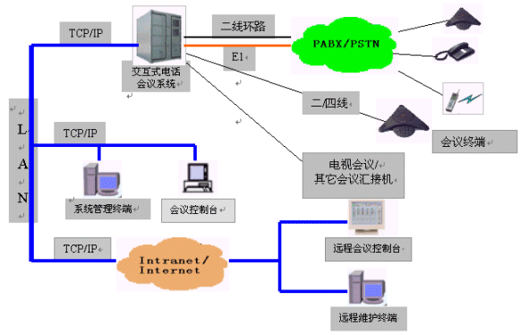 MCU-NT/I交互式電話會議系統(tǒng)為會議用戶提供了強(qiáng)大靈活的會議功能和豐富完善的網(wǎng)管功能。會議功能是在會議終端(或話機(jī))和會議控制臺上實現(xiàn)的;網(wǎng)管功能是在系統(tǒng)維護(hù)終端上實現(xiàn)的,并在靈活的組網(wǎng)方式中體現(xiàn)出它的方便易用。系統(tǒng)可以外接多個會議控制臺及多個系統(tǒng)維護(hù)終端,并且可以通過企業(yè)網(wǎng)或互聯(lián)網(wǎng)的遠(yuǎn)程連接,因此,所有功能都是可以遠(yuǎn)程實現(xiàn)的。