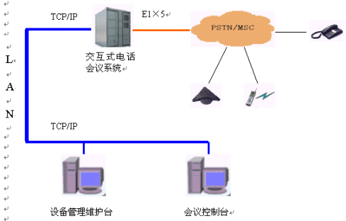· 本系統(tǒng)通過E1中繼或環(huán)路中繼與交換機(jī)相連,指定一個號碼作為會議的接入號。