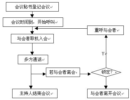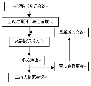 會議發(fā)起人完成會議登記,在指定的時間召開會議。各與會人員在會議時間內(nèi)撥打會議的接入碼,在系統(tǒng)語音的提示下,正確輸入會議號、密碼就可以參加會議。當(dāng)達(dá)到會議預(yù)約的成員數(shù)后,將拒絕新的用戶加入會議。