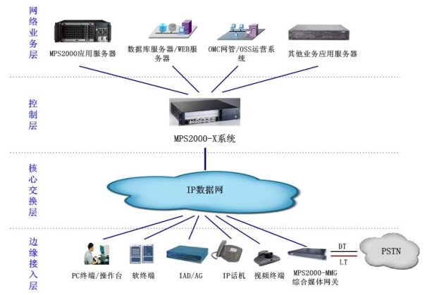 控制層:由MPS2000-X作為軟交換應(yīng)用,完成呼叫控制、媒體網(wǎng)關(guān)接入控制、資源分配、協(xié)議處理、路由、用戶認(rèn)證、計費(fèi)等功能,并可向用戶提供基本語音業(yè)務(wù)、增值語音業(yè)務(wù)、話務(wù)臺業(yè)務(wù)等。