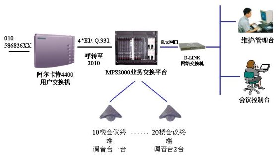 該會(huì)議系統(tǒng)通過4個(gè)數(shù)字中繼,與國(guó)電原有的阿爾卡特4400用戶交換機(jī)互連,通信采用Q.931信令。4路4線實(shí)現(xiàn)會(huì)議終端的接入,現(xiàn)使用3路,1路接國(guó)電10樓的調(diào)音臺(tái),2路接20樓的調(diào)音臺(tái),實(shí)現(xiàn)會(huì)議室擴(kuò)音設(shè)備的接入。通過以太網(wǎng)口與D-LINK網(wǎng)絡(luò)交換機(jī)互連,接入國(guó)電集團(tuán)的局域網(wǎng),實(shí)現(xiàn)維護(hù)管理及會(huì)議控制等功能。國(guó)電集團(tuán)的會(huì)議接入號(hào)為:010-586826XX,因原有交換機(jī)的功能局限,以該接入號(hào)到交換機(jī)后自動(dòng)呼轉(zhuǎn)到2010進(jìn)入MPS2000會(huì)議系統(tǒng),實(shí)現(xiàn)會(huì)議的呼入。