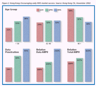 根據(jù)CSL的業(yè)績(jī)表明,香港也促進(jìn)了早期MMS市場(chǎng)的成功發(fā)展。MMS用戶的ARPU值比GSM用戶高132%。