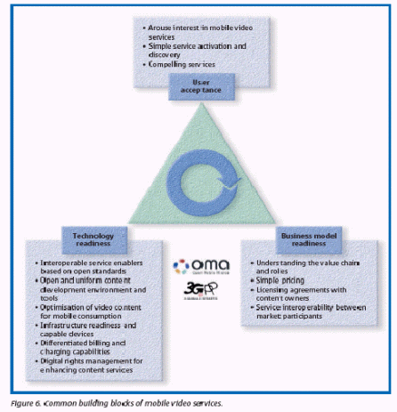 移動(dòng)視頻服務(wù)會(huì)成為其它已制定的多媒體應(yīng)用程序的一個(gè)補(bǔ)充。例如,電視并未因網(wǎng)絡(luò)的出現(xiàn)而消逝,同樣的,其它數(shù)字化或傳統(tǒng)的移動(dòng)傳輸應(yīng)用也不會(huì)因?yàn)橐苿?dòng)視頻的出現(xiàn)而消失。主要概況中略述了移動(dòng)視頻的好處。下面的文章則著眼于講述移動(dòng)視頻服務(wù)的普遍發(fā)展障礙,基于大規(guī)模市場(chǎng)的三個(gè)關(guān)鍵標(biāo)準(zhǔn)分別是:技術(shù)預(yù)備程度、商業(yè)模式預(yù)備程度和用戶接受程度。主要的觀點(diǎn)將做更細(xì)致的介紹。