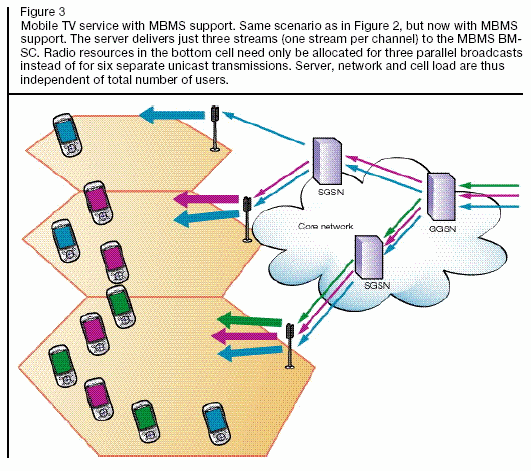 圖3描述了通過(guò)MBMS來(lái)提供移動(dòng)電視服務(wù)的相同情形。服務(wù)器對(duì)每個(gè)信道只需要傳送一條流媒體連接到MBMS BM-SC。在有需要的時(shí)候,在核心和無(wú)線網(wǎng)絡(luò)的數(shù)據(jù)流只有在需要的時(shí)候才被復(fù)制。在這個(gè)例子中,流媒體服務(wù)器只需要處理三個(gè)并發(fā)流媒體鏈接,因此,在最末端的無(wú)線節(jié)點(diǎn)使用三個(gè)并發(fā)傳輸會(huì)話就取代了原來(lái)的六個(gè)獨(dú)立單播連接。注::雖然例子是用于3GPP MBMS,它也適用於3GPP2 BCMCS。