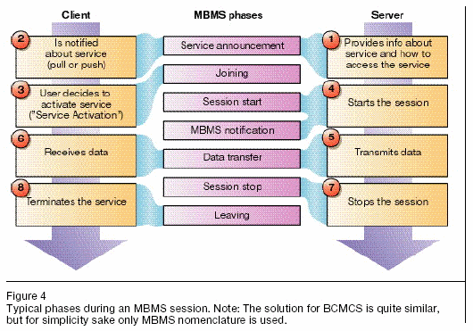 圖4展現(xiàn)了一個(gè)典型MBMS工作流程的多層參考模型。BCMCS的解決方案也是十分相似的,但是為了簡(jiǎn)單只是用MBMS命名。