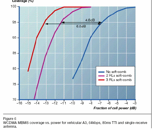 在3GPP Rel-6中,MBMS介紹了一些為那實(shí)際的MTCH分層堆積的能力加強(qiáng)。它們之中的其中一個(gè),軟件與FACH聯(lián)合,尤其值得注目。圖6顯示從軟件聯(lián)合得到的增益。與單獨(dú)的移動(dòng)連接相較,兩個(gè)移動(dòng)連接軟件聯(lián)合增益達(dá)到大約4.6dB;三個(gè)移動(dòng)連接軟件聯(lián)合增益達(dá)到大約6.5dB。