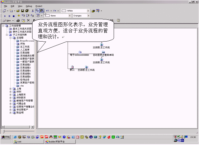 該產(chǎn)品通過將所有業(yè)務(wù)分別處于樹形化的節(jié)點上,可以直觀的對業(yè)務(wù)進行增加、刪除、修改的管理。增加子業(yè)務(wù)的時候,必須帶有業(yè)務(wù)類別,實現(xiàn)業(yè)務(wù)管理歸類化,避免業(yè)務(wù)管理的混亂。該產(chǎn)品還支持業(yè)務(wù)流程的樹形化表示,使業(yè)務(wù)流程開發(fā)者可以方便地了解業(yè)務(wù)流程的全局框架。