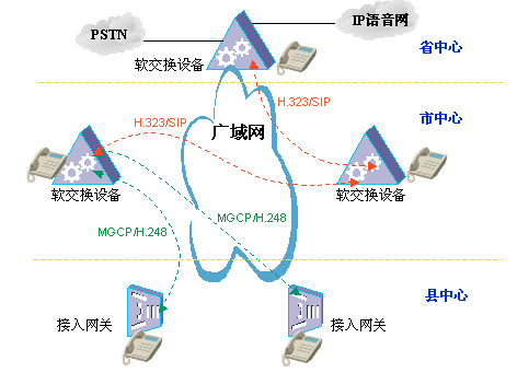 針對這種體系結構,軟交換技術就大有可為了,各地市布置軟交換設備,其間采用H.323/SIP點對點局間協(xié)議,負責各軟交換機之間的通信,在地市到縣區(qū)之間采用MGCP/H.248協(xié)議,這種協(xié)議體系充分吸取了軟交換體系控制與業(yè)務分離的思想,具有高度靈活性,可以兼容PSTN、運營商IP語音網、原有PBX系統(tǒng)等,并且從多方面保障話音質量;管理上由地市軟交換設備對縣區(qū)的接入網關設備進行統(tǒng)一管理,號碼進行統(tǒng)一分配;同時,由地市軟交換設備提供多達數十種增值業(yè)務,可以實現業(yè)務的統(tǒng)一升級,簡單方便。
