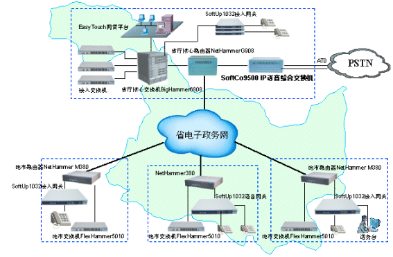 ×省×廳和與各地市局之間原來采用PSTN網絡實現語音通信,省局和市局,市局和市局之間每個月的通訊費用高達數萬元,無形之中長途電話費用已經成為日常行政支出中很大的一部分。該廳已經采用港灣公司NetHammer