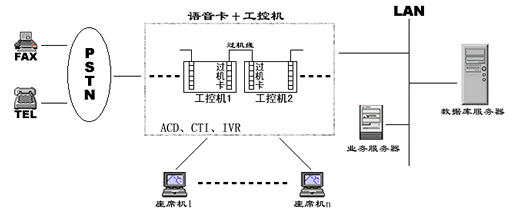 在一些小型CALL CENTER系統(tǒng)中,人們通常通過語音板卡加工控機(jī)的方式搭建系統(tǒng),通常一臺設(shè)備就集成了ACD、IVR、CTI等各種資源,各資源的使用、調(diào)派通過軟件進(jìn)行控制,有效的解決了建設(shè)成本高、系統(tǒng)構(gòu)造繁復(fù)的問題,具有相當(dāng)?shù)撵`活性。然而由于工控機(jī)和語音板卡容量有限,同時其標(biāo)準(zhǔn)最多只能是工業(yè)級標(biāo)準(zhǔn),因此在構(gòu)建相對大型的呼叫中心時就總是捉襟見肘。為了增加系統(tǒng)容量,解決多臺PC之間進(jìn)行通道交換的難題,人們又設(shè)計了過機(jī)卡和過機(jī)線來解決,其應(yīng)用系統(tǒng)如下圖:
