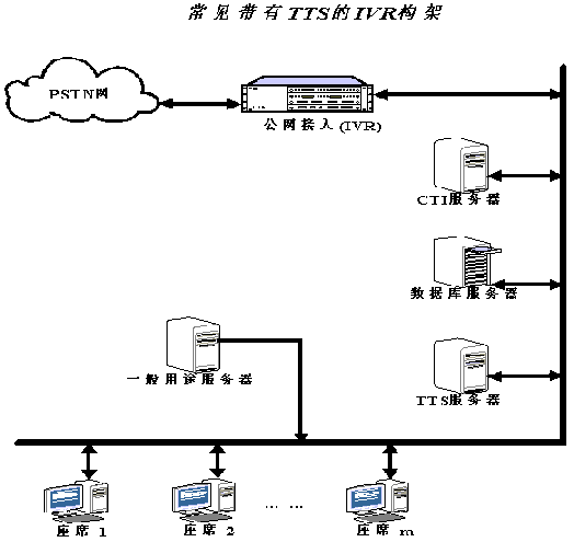 在一般的CTI應(yīng)用系統(tǒng)中,都會(huì)有IVR(交互式語音應(yīng)答系統(tǒng))。IVR系統(tǒng)是呼叫中心的重要組成部分,通過IVR系統(tǒng),用戶可以利用音頻按健電話輸入信息,從系統(tǒng)中獲得預(yù)先錄制的數(shù)字或合成語音信息。具有TTS功能的IVR可以加快服務(wù)速度,節(jié)約服務(wù)成本,使IVR為呼叫者提供7*24小時(shí)的服務(wù)。