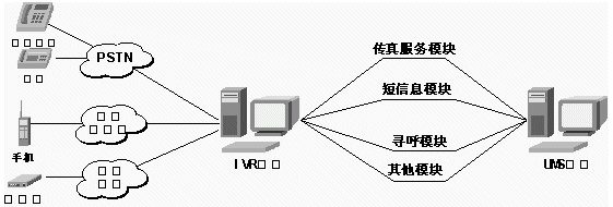 下圖為UMS系統(tǒng)的示意圖。其中IVR平臺與UMS 系統(tǒng)相連接。而UMS系統(tǒng)通過相應的服務模塊與不同的網絡進行信息共享,同時也可以和外部的Web Server進行信息交互。