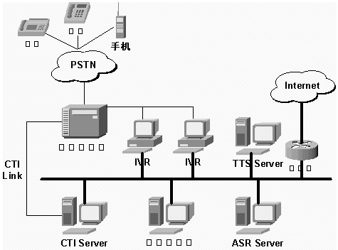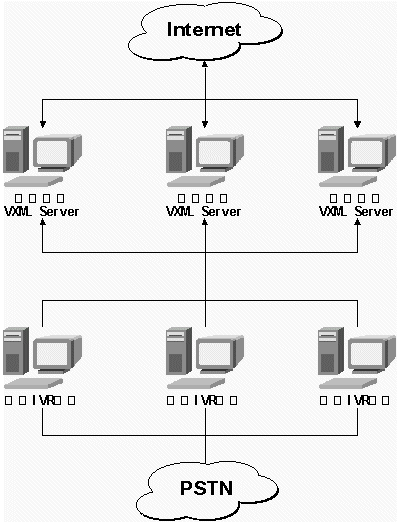 3)VXML技術:用以IVR平臺與互聯(lián)網絡交互信息。(IVR:Interactive Voice Response,交互式語音應答系統(tǒng)。)
