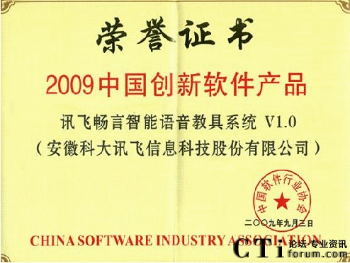 CTI論壇(ctiforum)9月8日消息:日前,訊飛暢言語音教具系統(tǒng)榮獲“2009中國(guó)創(chuàng)新軟件產(chǎn)品”。
