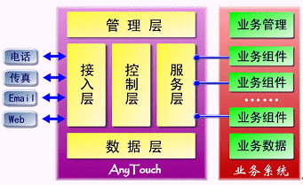 AnyTouch不僅僅是一個(gè)面向應(yīng)用開發(fā)商、系統(tǒng)集成商的CTI中間件產(chǎn)品,而且提供支持最終用戶自我維護(hù)、開發(fā)、編輯的業(yè)務(wù)接口與開發(fā)工具包;贏nyTouch,可以根據(jù)不同的行業(yè)需求開發(fā)出不同的業(yè)務(wù)應(yīng)用系統(tǒng),從而構(gòu)筑屬于自己的呼叫中心、企業(yè)增值服務(wù)、通訊服務(wù)、信息服務(wù)及CRM系統(tǒng)。