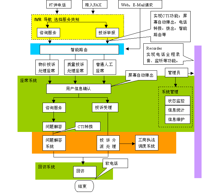 黎明網(wǎng)絡深入研究世界上最新的CTI技術的發(fā)展和應用,自主研發(fā)推出的12315消費者投訴受理系統(tǒng)采用當前主流的一體化的呼叫中心模式。一體化的呼叫中心模式具有投資少、易于實施、維護工作量較小、維護成本低的優(yōu)點。該系統(tǒng)建立在內部以太網(wǎng)基礎上,不同網(wǎng)絡(PSTN網(wǎng)、IP網(wǎng)、GSM/GPRS/CDMA網(wǎng))的消費者可以通過多種方式(電話、傳真、E-mail、短消息等)接入12315系統(tǒng),利用系統(tǒng)提供的服務進行投訴舉報或咨詢。
