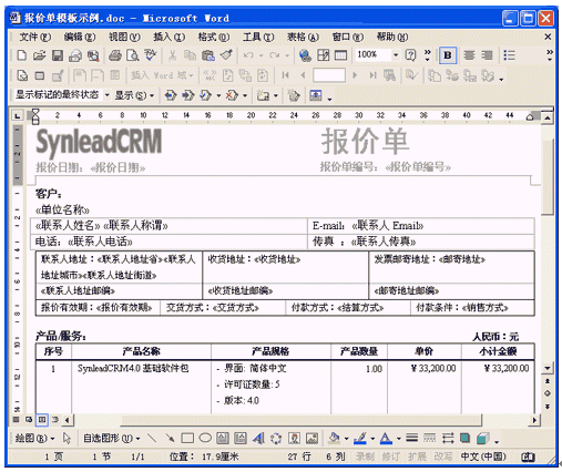 SynleadCRM企業(yè)版4.0很好地滿足了銷售自動(dòng)化管理、服務(wù)自動(dòng)化管理的上述需求,提供了開放的客戶化Word模板,使得用戶企業(yè)能夠根據(jù)實(shí)際情況不斷擴(kuò)展該應(yīng)用?蛻艋0逯苯釉赪ord中編輯,可直觀、方便地插入合并域字段或代碼,只要對(duì)Word稍加了解就可勝任模板維護(hù)工作。